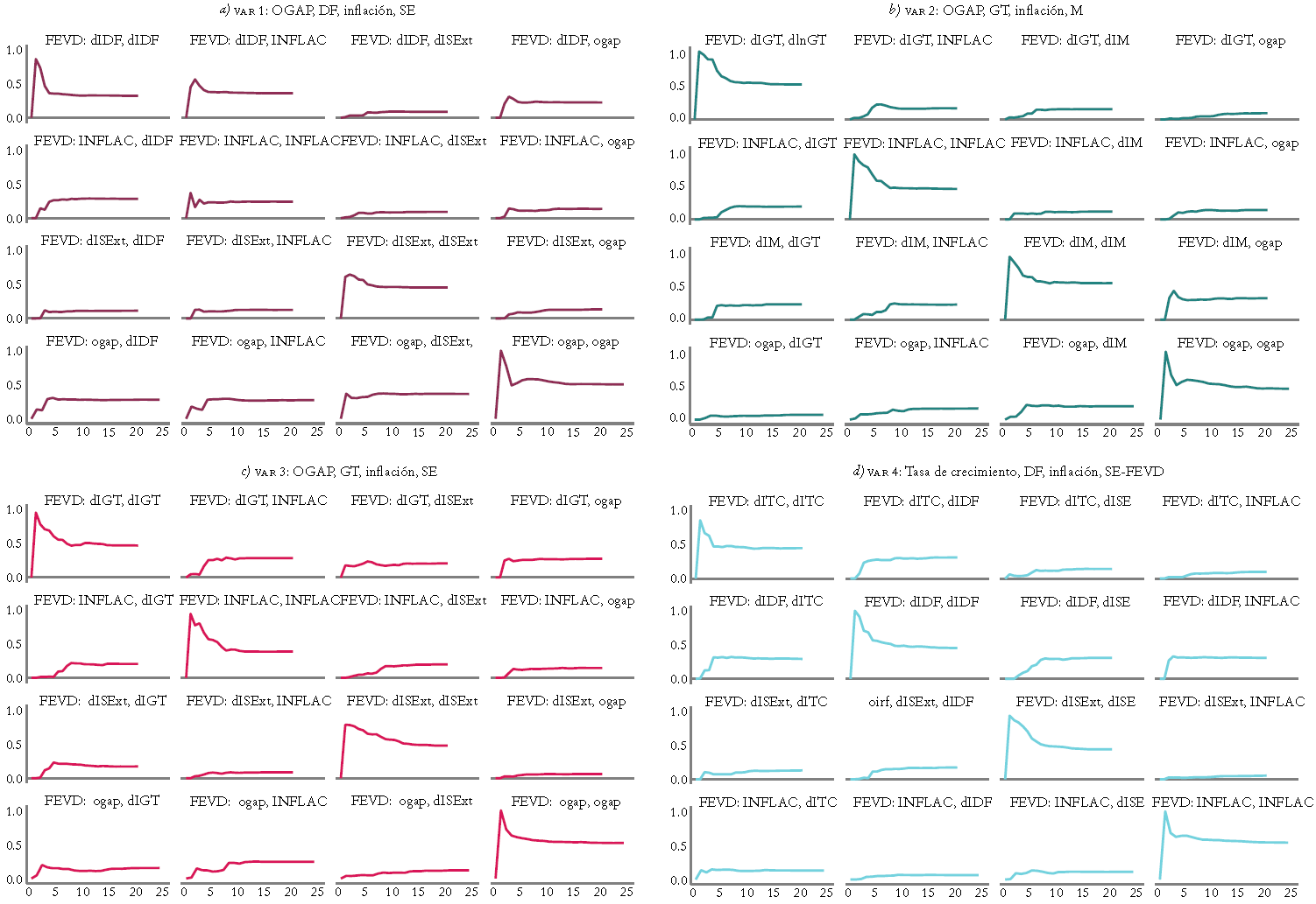 El análisis de descomposición de varianza (FEVD) demuestra la contribución de los factores seleccionados en la trayectoria futura de cada uno de los agregados; sin embargo, es importante destacar que predomina el componente de intravarianza sobre el de intervarianza; es decir, existe un patrón histórico en los agregados macroeconómicos estudiados que difícilmente se corrigen con el ajuste de una sola variable del sistema (Gráfica 10). Por ejemplo, al descomponer la varianza del error de la serie del GT en el modelo VAR 2, su alta intravarianza podría indicar que es una variable sensible a las acciones del gobierno, por lo que la política fiscal puede ser un instrumento de ajuste en la medida en que se comprenda el mecanismo de transmisión entre el instrumento y el objetivo, a lo que se hace referencia en el análisis de las FIR de los modelos seleccionados posteriormente.