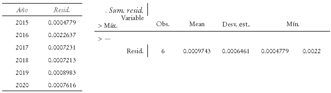 Primero, con el objetivo de garantizar la consistencia de las estimaciones, en adición a los test habituales de autocorrelación, normalidad y de raíz unitaria de los errores, necesarios para validar la estabilidad de los modelos VAR declarados, y con la intención de probar el poder predictivo de los modelos empleados, se estimaron los valores de 2015 a 2020, de donde se obtuvieron posteriormente los errores de predicción. Los asociados con el modelo VAR 4,7 con el que se trabajará más adelante, tienen una media de 0.0009 y una desviación estándar de 0.0006 (Diagrama 1).
