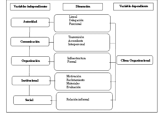 Se determinó que las variables independientes (autoridad, comunicación, institucional, organización y social) afectan fuertemente al clima organizacional, ya que existe una vinculación positiva considerable entre las variables independientes y la variable dependiente. En consecuencia, se afirma que el impacto que tienen las variables anteriormente descritas es el siguiente: la autoridad influye en el clima un 0.506; la comunicación en 0.386; la institucional en 0.580, la organización en 0.611 y la social en 0.588. Como se observa, la variable que mayor influencia tiene es la social, seguida de la institucional, y finalizando con la comunicación.