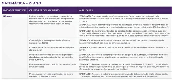 A BNCC e a CCF orientam que os alunos sejam estimulados a, por exemplo, investigar, raciocinar, representar, argumentar, comunicar, resolver problemas e estimar; os documentos não encorajam memorização nem processos sem significado. Ambos propõem a abordagem a partir da resolução de problemas e o uso de calculadora e de recursos digitais. Além disto, as estruturas organizacionais dos dois documentos distinguem unidades temáticas, anos escolares e objetivos de aprendizagem, que permitem identificar a distribuição dos conteúdos a serem ensinados, estabelecendo progressivamente as metas de aprendizagem cognitiva ao longo da escolaridade. Identificam-se assim elementos estruturantes dos documentos: na BNCC, os objetos de conhecimento e as habilidades e, na CCF, os objetivos específicos e os indicadores de aprendizagem (tabela I).