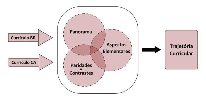 A figura III ilustra a leitura combinada, o processo metodológico do estudo. O caráter qualitativo da metodologia determinou que a análise fosse realizada de forma dinâmica, levando à identificação de quatro ênfases interdependentes, sem relação hierárquica entre elas: (i) panorama - caracterizada por uma leitura concomitante dos documentos, ponto de partida da análise; (ii) aspectos elementares - caracterizada pela identificação, nas referências curriculares, de aspectos elementares no ensino de números; (iii) paridades e contrastes - caracterizada pela identificação de equivalências, similaridades e diferenças emergentes dos elementos estruturantes dos documentos; e (iv) trajetória curricular - caracterizada pelo mapeamento simultâneo das duas propostas curriculares. Apesar das quatro ênfases terem focos diferentes, o processo de análise e construção da trajetória curricular se caracterizou pela interposição das mesmas, em particular das ênfases panorama, aspectos elementares, e paridades e contrastes. A ênfase trajetória curricular tem natureza conclusiva. Cada uma destas ênfases será detalhada nas subseções que seguem.