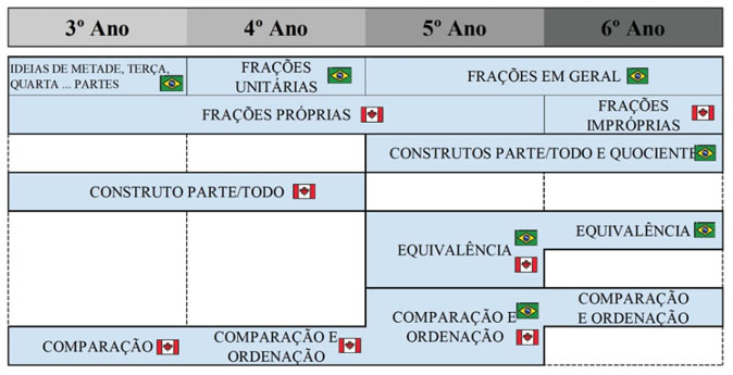 A distinção dos aspectos elementares é um pilar para a construção da trajetória curricular. Não é trivial associar dois elementos estruturantes a partir da íntegra de suas redações. Consideremos os elementos estruturantes destacados na tabela II, que se referem à abordagem inicial de frações. Nossa análise permite distinguir aspectos elementares em suas redações: ideias de metade, terça, quarta, quinta e décima partes, conceitos de frações unitárias e de frações em geral, conceitos de frações próprias e impróprias, construtos parte/todo e quociente, equivalência, comparação e ordenação. A trajetória curricular não traz a redação completa dos elementos estruturantes. Nela distinguem-se os aspectos elementares observados, visando a uma percepção sintética e panorâmica, como em um efeito zoom out. Por exemplo, nos elementos estruturantes do 5º ano dos dois referenciais curriculares identificamos os aspectos elementares equivalência e comparação e ordenação de frações, que são destacados e associados aos dois países na trajetória curricular (figura IV). No entanto, no 6º ano, apenas o documento brasileiro volta a tratar de tais aspectos elementares. A trajetória não registra, então, esses aspectos elementares na dimensão canadense nesse ano escolar. Pode-se observar ainda que apenas o documento canadense propõe a abordagem de comparação de frações no 3º ano, ano que marca o início do início de frações em ambos os documentos.