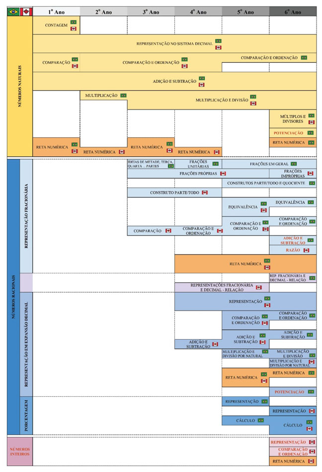 A relação estabelecida na trajetória curricular não pretende oferecer juízo de valor entre o ensino de números no Brasil e no Canadá, apontando, por exemplo, qual país exerce as melhores escolhas curriculares. Entendemos que cada país tem suas particularidades e que, por razões diversas, o que é apropriado para um pode não ser adequado para o outro. Não questionamos as “raisons d’être” dos currículos nem o valor dos documentos orientadores, partimos do princípio de que estes documentos existem e têm um papel central na prática docente.