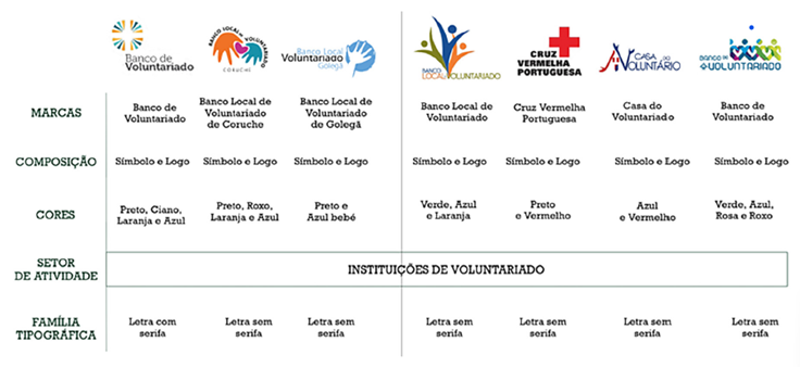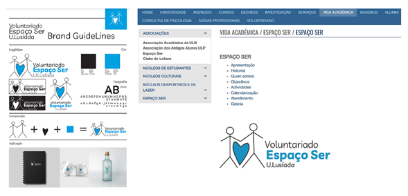 Por otro lado, en términos de identidad física (véase la tabla 1 y la figura 9), el nombre de la marca corresponde a “Ser Espacio de Voluntariado”. El nombre se materializó en un símbolo visual (dos contornos de personas con un corazón en el centro), un logotipo (nombre) y una denominación (ULusíada). Al mismo tiempo, la marca se comunicó en los productos, cuidando el uso de los colores y la tipografía al aplicar los gráficos de la marca. La identidad psicológica de la marca engloba su personalidad, la forma en que conecta con los clientes (Baynast et al., 2021), que desde una perspectiva de diseño (Airey, 2010) puede referirse al concepto de relevancia de la marca. El territorio (Baynast et al., 2021), dentro del espacio de mercado, está directamente relacionado con su carácter distintivo (Airey, 2010). Los valores culturales de la marca por sí solos no se tienen en cuenta, pero, si lo miramos desde otra perspectiva, el “Espacio Ser” es una valencia de la Universidad Lusíada do Porto. El programa de voluntariado promueve una identificación con la Universidad y viceversa.