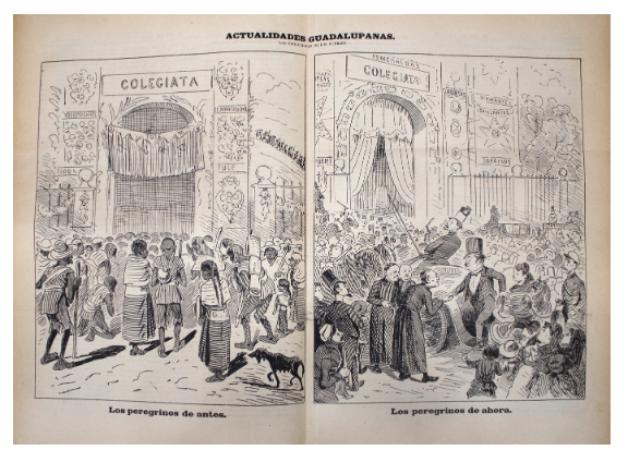 En 1895 El Hijo del Ahuizote publicó la caricatura “Actualidades guadalupanas”, dos escenas dividen la imagen: la primera parte representó a “los peregrinos de antes”, por medio de una procesión de indígenas llegando a la Colegiata en la Villa de Guadalupe. El templo está adornado con guirnaldas de cempasúchil, yolloxochitl y tule. El siguiente panel, en cambio, describió a los “peregrinos de ahora” como una comitiva de aristócratas en carruajes. Mientras tanto, los obispos reciben a un caballero. La iglesia, por su parte, luce perlas, esmeraldas, turquesas, diamantes, brillantes, topacios y rubíes (foto 1).