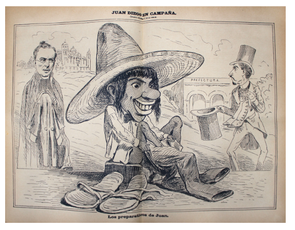 La complicidad entre el Ayuntamiento de Guadalupe Hidalgo y la empresa de transformar el Tepeyac en un centro de peregrinación de talla internacional quedó registrada en el seguimiento de las mejoras materiales de la municipalidad. En la caricatura “Juan Diego en campaña” vemos al presidente municipal pedir limosna con un sombrero de copa a Antonio Plancarte situado frente a la Colegiata (foto 3). El gesto del prefecto remite a que durante los años previos a la coronación se realizaron trabajos de urbanización en Guadalupe Hidalgo, pero a falta de fondos la municipalidad pidió préstamos como lo hiciera Plancarte.