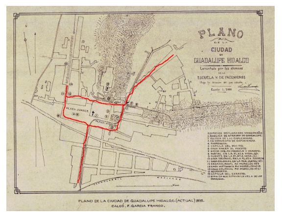 Foto 4. Plano de la Ciudad de Guadalupe Hidalgo, 1895. Mapoteca Manuel Orozco y Berra. La línea roja señala la tubería nueva de fiero. Elaboración propia a partir del ahcm, 1892.