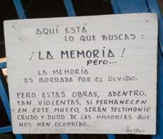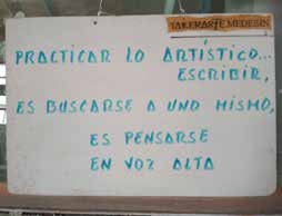 Al entrar al taller, que está justo al frente de un mirador improvisado, salen al encuentro varios carteles con frases que interpelan al visitante: “ven, tú también, desde TallerarTe, queremos con VIDArte a la vida en el arte”; “practicar lo artístico, escribir, es buscarse a uno mismo, es pensarse en voz alta”; “aquí está lo que buscas: ¡LA MEMORIA! Pero… La memoria es borrada por el olvido. Pero estas obras, adentro, tan violentas, si permanecen en este museo, serán testimonio crudo y duro de las historias que nos han ocurrido (para no repetirlas)”. Estos carteles fueron escritos por el puño y letra de Guillo, como se muestra en la imagen 6. En estas frases sugerentes se esboza la pedagogía del artehacer como una invitación abierta a todas las personas, sin excepción, a ejercitarse en lo artístico con una disposición libre que posibilite la expresión del mundo interior de la barriada.