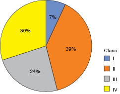 De los 46 participantes en el estudio, 19 (41%) fueron mujeres y 27 (59%) hombres. La edad promedio fue de 38 ± 14.6 años, el peso promedio: 71 ± 10.2 años. La tensión arterial media: 58.6 ±13.1 mmHg. La clasificación del choque hipovolémico por déficit de base representó: clase I: tres pacientes (7%), clase II: 18 casos (39%), clase III: 11 sujetos (24%), clase IV: 14 enfermos (30%) (Figura 1). La hemoglobina: 11.6 ± 2.6 g/dL, creatinina: 1.03 ± 0.65 mg/dL, urea: 35.5 ± 20.7 mg/dL. El balance acumulado: 4.48 ± 2.8 L. Marcadores oncóticos: proteínas totales: 5.7 ± 1.4 g/dL, albúmina: 2.35 ± 0.68 g/dL, PCO: 14.6 ± 3.5 mmHg. Índice de Briones: 0.25 ± 0.07 mmHg. Los marcadores de hipoperfusión: DB: -7.9 ± 5.2 mmol/L, lactato: 3.01 ± 2.2 mmol/L, ΔCO2: 6.98 ± 4.6 mmHg.