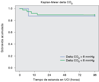 El análisis de Kaplan-Meier también mostró significancia estadística en la sobrevida de pacientes con ΔCO2 < 6 mmHg (Figura 7).
