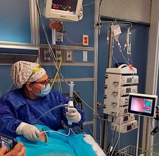 La técnica de LBA por broncoscopia (Figura 1) se realizó a través del tubo endotraqueal con el fin de llegar a los bronquios para obtención de la muestra. En pacientes bajo analgesia y sedación profunda con escala de agitación-sedación de Richmond (RASS, por sus siglas en inglés) −5, no se empleó mayor aporte de sedación o analgesia; no obstante, en pacientes despiertos, se utilizó 1 mg/kg intravenoso (IV) de propofol o 0.2 mg/kg IV de midazolam, así como analgesia a base de 200 a 400 μg IV de buprenorfina, para mejora del confort del paciente durante el procedimiento, así como uso de relajante muscular vecuronio IV 0.1 mg/kg si fuera necesario. Posteriormente, se colocó una boquilla en la arcada dentaria; además de instalar una válvula de PEEP en caso de que tuvieran una programación de PEEP extrínseco de 10 cmH2O o más en el ventilador en la inserción del tubo endotraqueal; para evitar la desaturación, se preoxígeno, con incremento del aporte de FiO2 al 100% antes y durante todo el procedimiento. Después se procedió a la inserción del videobroncoscopio flexible Ambu® de aScope™ de 6 mm de diámetro con canal de trabajo de 2 mm de diámetro, con dirección hacia la carina en donde encontramos la división entre el bronquio derecho y el izquierdo, iniciando con inserción en el derecho de primera instancia y posteriormente con el izquierdo con sus respectivas secciones de bronquios; una vez situados en la luz del bronquio, se aspira directamente si hay suficientes secreciones y/o se cargan 20 mL de solución salina al 0.9% en 3-5 jeringas de 20 mL y se instilan de 20 a 100 mL de la misma solución para ser aspirados por el broncoscopio hacia la trampa, ya previamente conectada hacia la succión, y de ahí obtener una alícuota del LBA de la trampa con técnica estéril, para darse finalizado el evento.