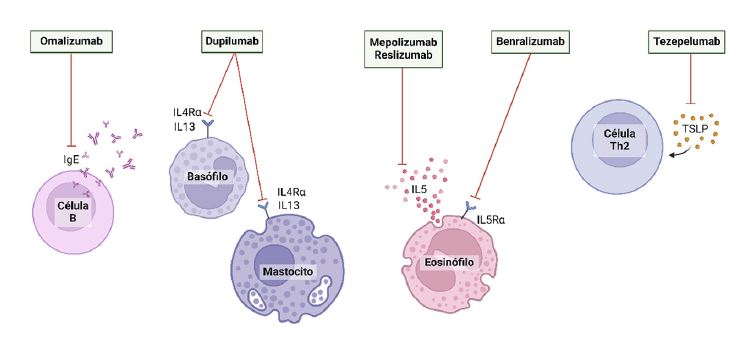 Dupilumab se encuentra aprobado por la Food and Drug Administration (FDA) para el tratamiento de la dermatitis atópica, de moderada a grave, en pacientes no controlados; incluso en 2018 se aprobó para pacientes con asma moderada a grave (eosinófilos en sangre > 150 células/μL y/o FeNO > 25 ppb). Ha demostrado resultados prometedores en pacientes con rinosinusitis crónica y esofagitis eosinofílica.28