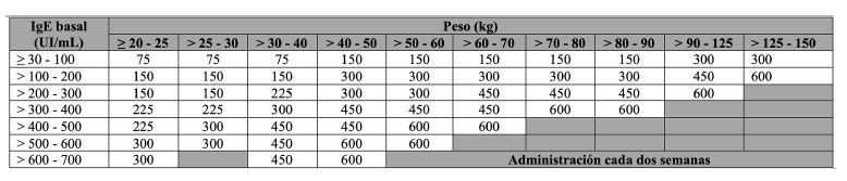 La dosis recomendada en pacientes con asma es de 75 a 375 mg, por vía subcutánea; en rinosinusitis crónica y poliposis nasal, al igual que en los casos con alergia alimentaria mediada por IgE, 75 a 600 mg por vía subcutánea; en urticaria crónica espontánea de 150 a 300 mg por vía subcutánea, cada 2 a 4 semanas. La dosis se determina miligramos (mg) y la frecuencia por los valores de IgE total (IU/mL) medida antes del inicio del tratamiento y por peso en kilogramos (kg). Figura 2
