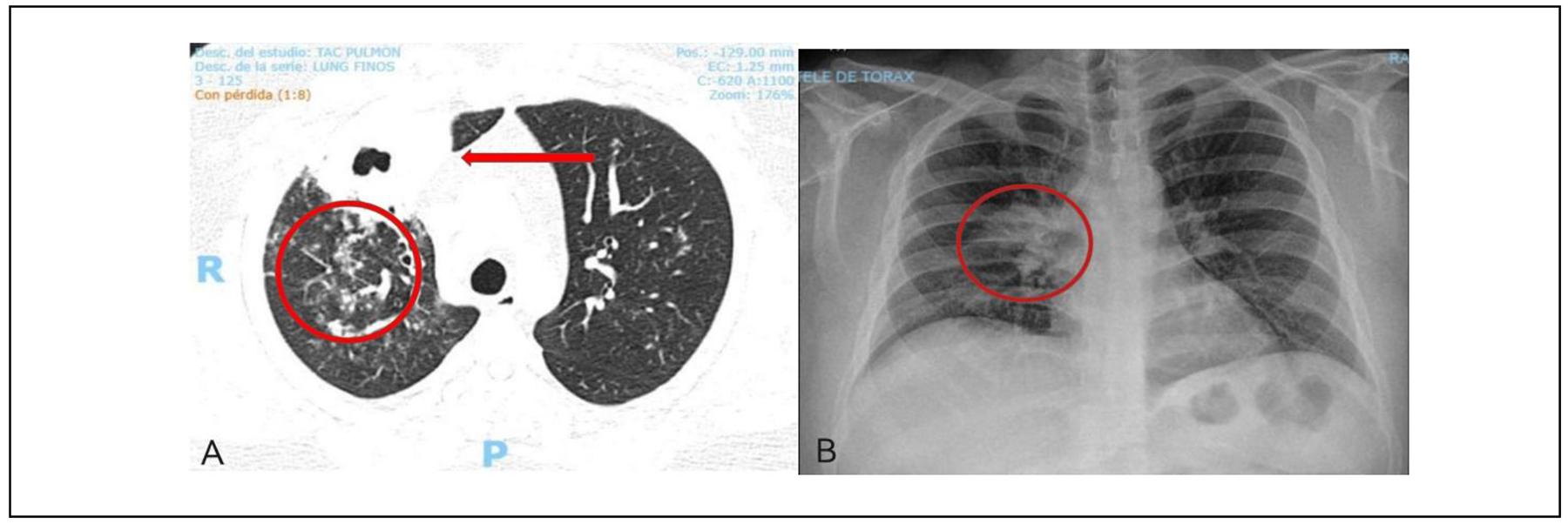 Figura 1. A) Tomografía Computarizada de tórax en donde se aprecia la cavitación en el lóbulo superior derecho con espesor de pared de 9 mm, así como medida transversal y de altura de 36 x 60 x 36 mm y media de 8 x 14 mm (flecha roja). Nódulos en árbol de gemación (círculo rojo). B) Radiografía de tórax con opacidad parahiliar derecha de morfología ovalada, con diámetro máximo de 4 cm (Círculo rojo).