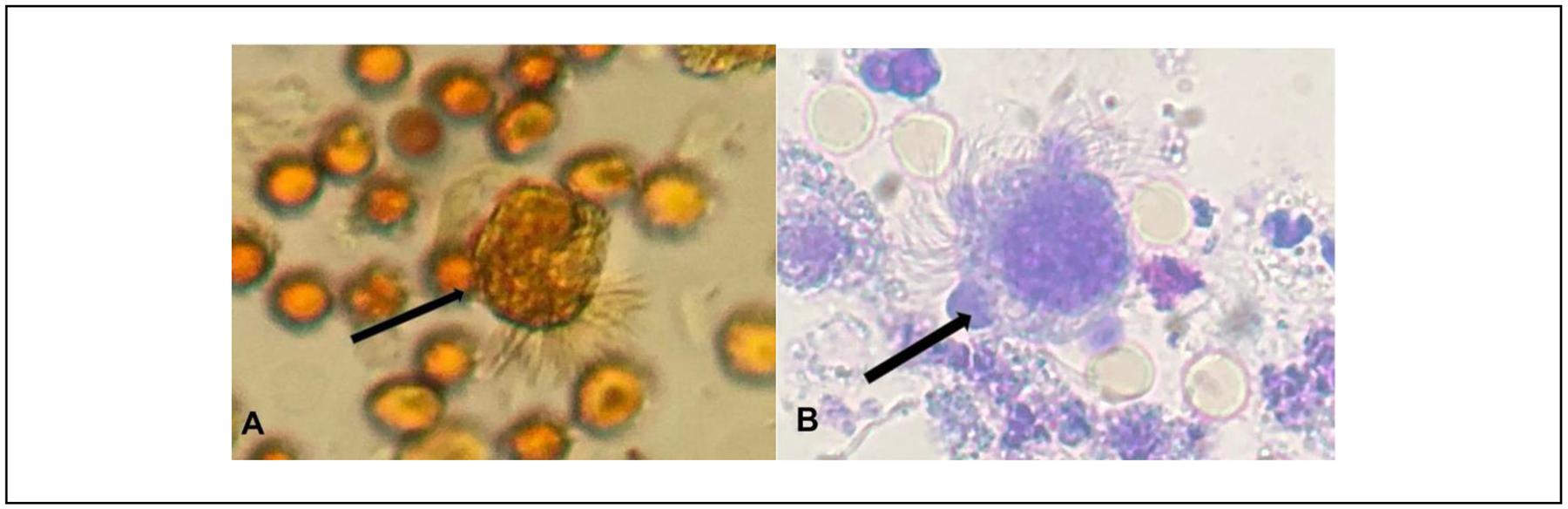 Figura 2. Identificación de Lophomona blattarum en material de lavado bronquial. A.Tinción de Lugol B.Tinción de azul de metileno. (Señalado con flechas negras).