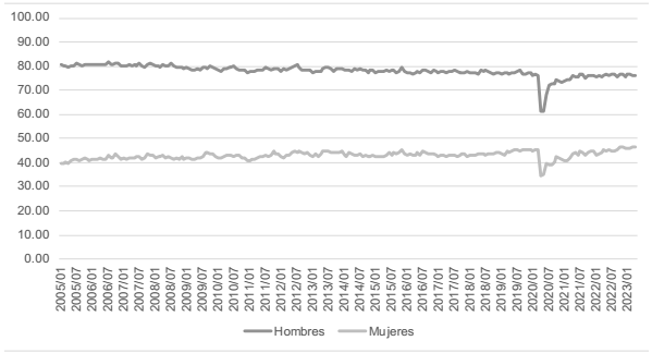 Gráfica 1 Tasa de participación laboral 2005-2023, mensual, por sexo