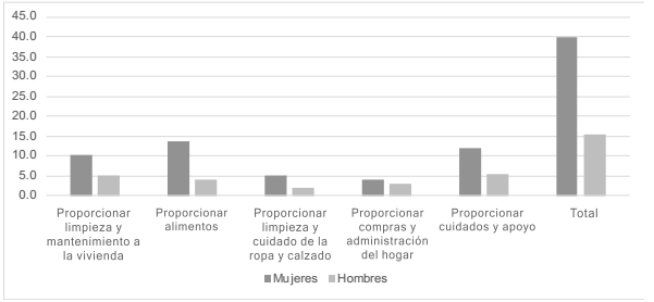Dichas encuestas reflejan que, en promedio, las mujeres en México dedican 40 horas a la semana al trabajo no remunerado, con las cuales proporcionan principalmente cuidados, alimentos y limpieza; mientras que los hombres dedican solo 15 horas a la semana a cuidados y mantenimiento. La actividad que más equitativamente se reparte es la de administración del hogar (Gráfica 2).