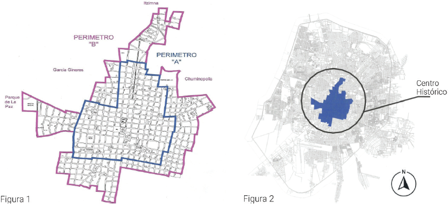 Figuras 1 y 2 Plano de la Zona de Monumentos Históricos de la ciudad de Mérida (1), establecida en el Decreto Federal del 18 de octubre de 1982, publicado en el Diario Oficial de la Federación, así como su ubicación con respecto a la ciudad de Mérida en 2004 (2).