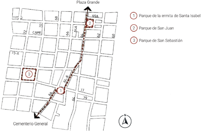 Figura 3 Plano del contexto conformado por el parque y la ermita de Santa Isabel, así como las calles 64 y 64 A.