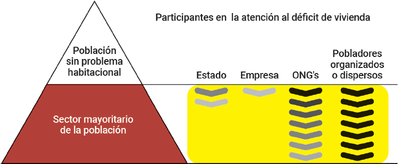 Los únicos actores en la Figura 1 que realmente profundizan en la atención al déficit son los mismos pobladores, por la necesidad de un lugar dónde habitar y obtener los beneficios de una vivienda adecuada, que al no contar con los recursos necesarios, tanto económicos como de conocimientos al irse perdiendo la cultura constructiva, los resultados de su esfuerzo son de muy baja calidad y con grandes deficiencias en la durabilidad de las construcciones, por ser muchas veces con materiales de reúso o de desecho, además de la aspiración a utilizar materiales de alto costo como el concreto y el acero, por lo que finalmente tampoco logran la vivienda adecuada.