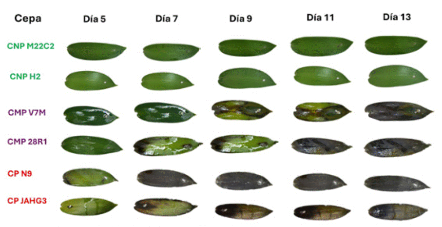 Se seleccionaron seis cepas en cuanto al grado de patogenicidad mostrado en hojas de V. planifolia. Aquellas cepas que al pasar los 13 días de evaluación no mostraron daño a la hoja y estas permanecieron verdes y turgentes se clasificaron en no patógenas, por su parte aquellas que mostraron un daño moderado comenzando la necrosis a los 9 días se clasificaron en cepas moderadamente patógenicas y aquellas que mostraron un daño acelerado a la hoja desde el día siete se clasificaron en cepas altamente patógenas (Figura 1).