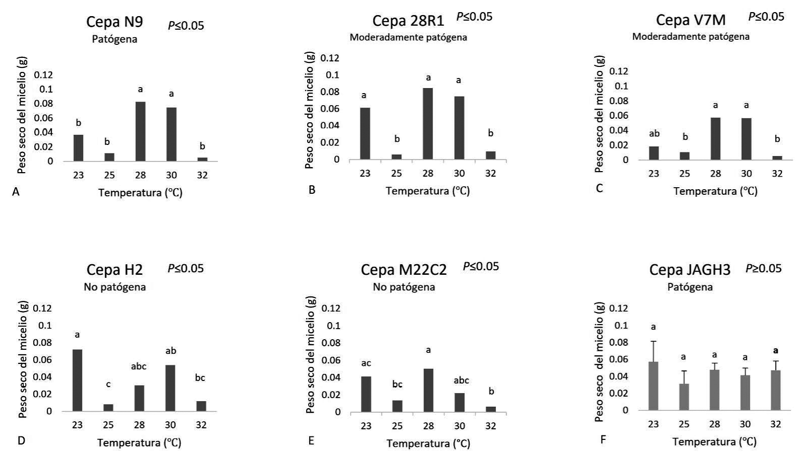 Figura 2 Peso seco del micelio (biomasa) de las cepas N9 (A), 28R1 (B), V7M (C), H2 (D), M22C2 (E) y JAGH3 (F) de F. oxysporum endófito de Vanillae sp. desarrolladas a 23, 25, 28, 30 y 32 °C en caldo papa dextrosa durante 15 días. Letras diferentes sobre las barras indican diferencias significativas entre los tratamientos (A, B, C, D y E, Kruskal Wallis, P ≤ 0.05; F, Tukey, P ≤ 0.05).