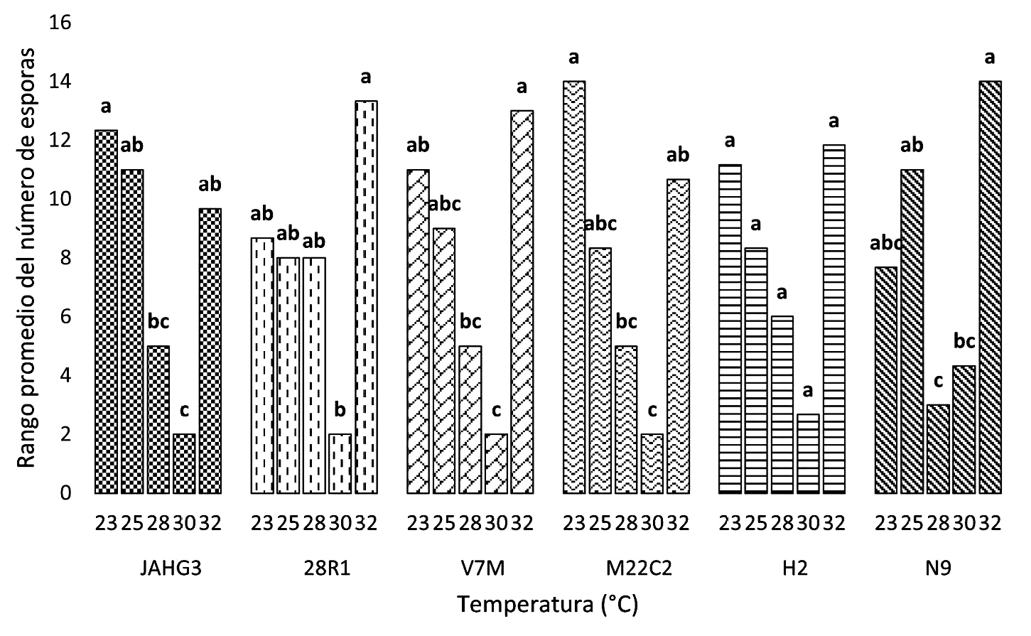 Figura 3 Número de esporas de las cepas de F. oxysporum N9, 28R1, V7M, H2, M22C2 y JAGH3 desarrolladas a 23, 25, 28, 30 y 32 °C en caldo papa dextrosa durante 15 días. Letras diferentes sobre las barras en un mismo grupo indican diferencias significativas entre los tratamientos Kruskal Wallis, P ≤ 0.05.