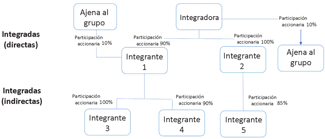 Sociedades integradas: aquéllas en las cuales más del 80% de sus acciones con derecho a voto son propiedad, directa, indirecta o de ambas formas, de una sociedad integradora como se puede observar en la Imagen 1.