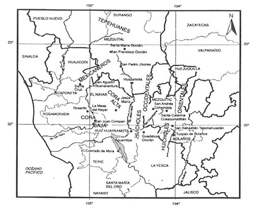 En la Sierra Madre Occidental comparten territorio los náayari (coras), 1wixárica (huicholes), o’dam (tepehuanos), mexican (mexicaneros) y mestizos. Específicamente los náayarite habitan en el estado de Nayarit, dentro de la denominada Cora Alta (partes altas de la sierra), en el municipio Del Nayar y, de los que forman parte de la Cora Baja (faldas de la sierra), en Acaponeta, Rosamorada y Ruiz: