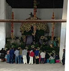 La trasformación del espacio y los tiznados no es súbita, sino que es una prolongada construcción relacionada con el “camino del sol” que inicia después de la celebración de la Santa Cruz (3 de mayo), día en el que “ya está la cruz, así se queda”, siendo Huazamayor, con ayuda de algunos judíos (sin borrarse), el encargado de elaborarla y “levantarla”. Tiene un momento importante durante la Santísima Trinidad (junio), la fiesta de Tayau, el sol en plenitud, momento en el que Huazamayor “arregla”11 a la Santísima Trinidad12 que se encuentra en el altar de la iglesia. Continúa en la canícula, durante la festividad de Santiago/Santa Ana,13 25 y 26 de julio, cuando los jinetes santiagueros -entre los que se encuentra Centurión, pero sin los atavíos que lo caracterizan durante la Judea-, descuartizan gallos y gallinas, es decir al sol,14 para que las lluvias puedan terminar de caer durante la “segunda vuelta”15 de su temporada.