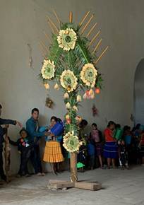 Mientras esto sucede en el exterior, en el interior de la iglesia desde el amanecer hay una nueva transformación; lo del día anterior se retira, la “corona” y las ramas verdes son arrojadas afuera del atrio, del lado oriental, y todo se llena de flores de clavellina (Preudobombax ellipticum) rojas y blancas y frutos, especialmente naranjas.