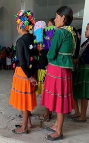 Mientras los hombres fabrican su sable, las mujeres elaboran el calzón de manta y la faja, obligatorios para todos los borrados y, cuando así lo solicitan los hombres, hacen pequeños morrales26 con los colores y diseños que quieran (véanse Fotos 3 y 4), y que algunos utilizan atados a la cintura, donde recargan las largas lanzas. Igualmente realizan los portavelas (cilindros de papel de china de colores) que utilizarán en las procesiones de mujeres. Anteriormente, era el tiempo de hacer los ramitos de flores -que han sustituido por moños de colores- que amarran a la ropa y cabello de “los angelitos”, niñas,27 y de coserse falda y blusa que estrenarán después del Domingo de Resurrección (véase Foto 5).28