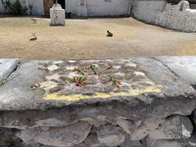 A mediodía, en un petrograbado que se encuentra en la barda norte del atrio, viendo hacia la cruz atrial y la entrada de la iglesia, una Anciana (viuda con cargo vitalicio) coloca líneas de maíz triturado de los cinco colores:34 en la línea y los hoyos que quedan al norte distribuye maíz amarillo; en la siguiente, morado; la que sigue, rojo; la siguiente, blanco y la última, pinto. En cada una de las cuatro esquinas del cuadrado interior coloca tamalitos de pinole de los cinco maíces, junto con cinco pequeños peyotes. En torno al hoyo del centro coloca cinco flores cuyos tallos convergen en el centro y los brotes dirigidos hacia los puntos cardinales. Es el mundo náayari que se está creando en estos días.