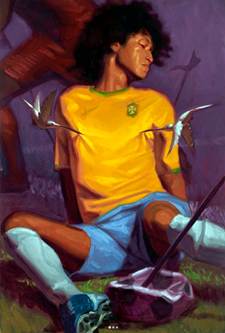 Audiodescripción: Sobre un fondo morado, con pasto verde y la silueta de un jugador de futbol corriendo, está sentado con las piernas abiertas un joven negro-afromexicano, prieto con su cabellera rizada y negra. Tiene los ojos cerrados, como en un sueño, y su rostro se dirige al lado derecho de la imagen. Está vestido con uniforme de futbol: camiseta amarilla con verde, de la selección nacional de Brasil, en el pecho dos colibríes amarillos y blancos le muerden la camiseta a nivel de los pezones; pantalones cortos azul claro, calcetines hasta la rodilla de color blanco, zapatos especiales para jugar futbol color azul. En primer plano está un balón pinchado por una lanza; el balón está desinflado.
