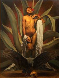 Sobre un fondo terracota se despliega un agave de casi dos metros, de doce hojas carnosas, verdes, con filos delimitados en su exterior, con otras hojas naciendo de ellas. En el centro, un hombre desnudo, prieto y joven, nos mira con la barbilla alzada, con un gesto de seducción. En su oreja de lado derecho, tiene una flor roja y grande que adorna su rostro con poco vello, con poca barba. Es un joven de unos 25 años, delgado, oscuro. En el centro de la imagen, vemos su pene y sus rodillas juntas. En la muñeca derecha, tiene una serpiente ocre enredada por todo su brazo; en el músculo deltoides de ese mismo brazo derecho, tiene una sábana blanca enrollada que cae por detrás de él y la vemos enrollada de nuevo en su muñeca izquierda. A la altura de sus piernas, hay un cuervo negro con las alas abiertas a punto de picotear un cráneo humano.
