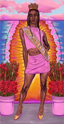 Audiodescripción: en la parte superior de la imagen hay un cielo azul con nubes rosas, debajo de ese cielo aparecen los rayos de la Virgen de color anaranjado afuera y en el centro de color amarillo; alrededor de esos rayos de vigente leemos: “dejaré mi canto en testimonios, y mi corazón renacerá y regresará, se extenderá mi recuerdo y perdurará mi nombre”. A los lados de esta primera imagen, hay dos cubetas grandes de pintura, color rosa, que sirven como floreros para dos ramos de astromelias con sus tallos largos y verdes y sus flores rojas. En el centro vemos a una mujer negra trans vestida con una minifalda entallada de color rosa y una ombliguera sin mangas del mismo color; tiene un arete en el ombligo y está parada de lado. Calza unos tacones color naranja metálico. De su hombro izquierdo cae una banda que dice “Soy prieta ¿y?”. La mujer tiene su mano derecha recargada en su cintura porque está parada de lado. Su rostro tiene una expresión seria pero no arrogante, tiene aretes en la columela y las alas nasales; tiene trenzas largas, negras y delgadas por todo su cabello que caen hasta la altura de su ombligo. Porta una corona dorada, como de Miss Universo.