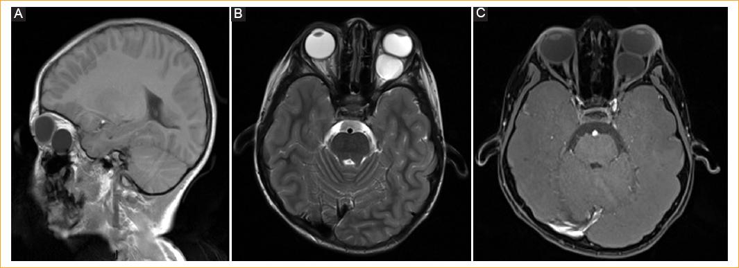 Figura 2 Resonancia magnética. A: en T1 sagital se identifica una imagen hipointensa retroocular de 2.1 cm (transverso) × 1.8 cm (rostrocaudal) × 2.1 cm (longitudinal) que desplaza el globo ocular en sentido anterior, de contornos lisos continuos y contenido homogéneo. B: en T2 axial, la lesión muestra comportamiento hiperintenso con interfase con la pared posterior del globo ocular. C: en T1 axial con gadolinio se observa la lesión con poco reforzamiento de la cápsula, sin compromiso vascular interno.
