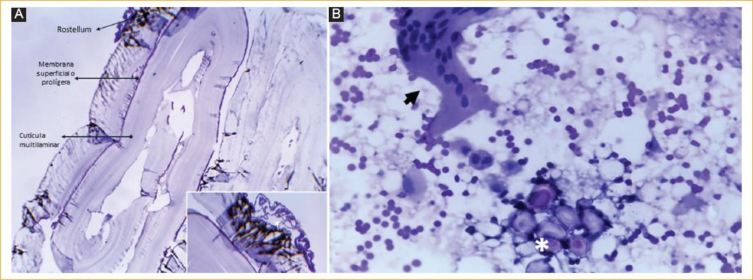 Figura 3 Imágenes histopatológicas. A: cápsula de quiste constituida por cutícula multilaminar gruesa; la membrana superficial es delgada. En el recuadro se observa el rostelo con ganchos. Tinción de HE original × 100. B: contenido del quiste con numerosos protoescólices (asterisco) en asociación con linfocitos y células gigantes multinucleadas (flecha). Tinción de HE original × 400.