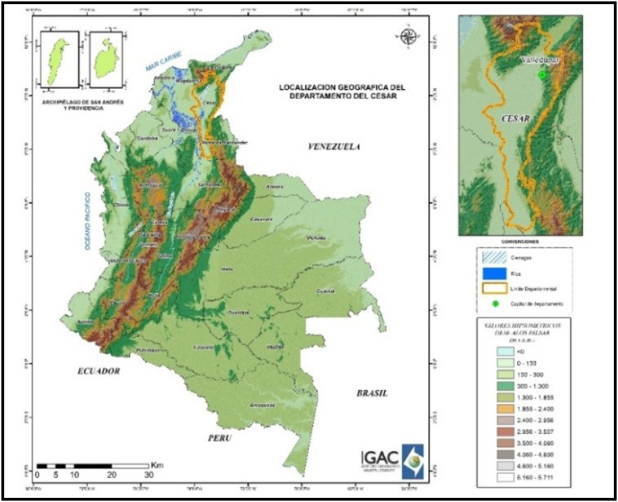El Departamento del Cesar se encuentra ubicado al nororiente del país, sobre la región Caribe, al oriente limita con Venezuela y el Departamento de Norte de Santander, al norte con La Guajira y al occidente con los departamentos de Magdalena, Bolívar y Santander; tiene una extensión aproximada de 22.562 km² y cuenta con 25 municipios. Su capital es el municipio de Valledupar, ubicado en la parte norte del departamento (Figura 1).