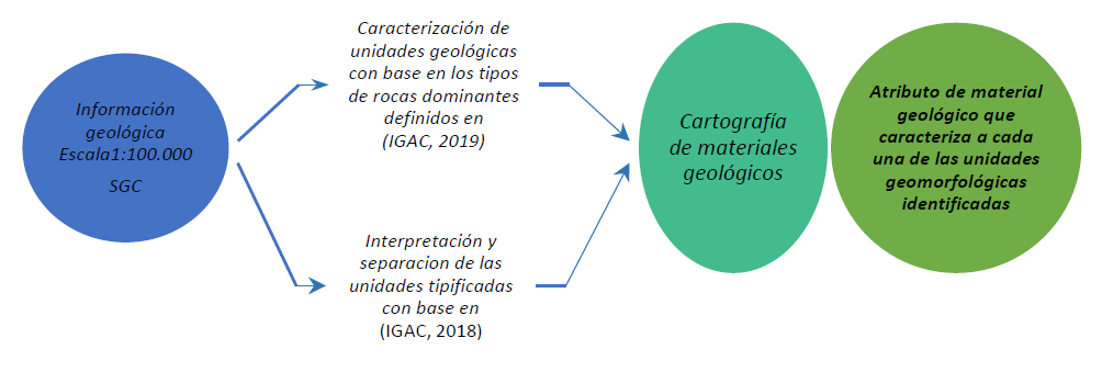 Para la elaboración de la cartografía geomorfológica aplicada a levantamiento de suelos escala 1:25.000 se utilizaron varios insumos: información geológica, la leyenda nacional de geomorfología aplicada a levantamiento de suelos escala 1:25.000 (Tabla 5 ) y productos de sensores remotos como ortofotomosaicos y bloques fotogramétricos derivados de fotografías aéreas del IGAC, imágenes ópticas multiespectrales de los sensores RapidEye y SPOT, proporcionadas por el banco nacional de imágenes, el modelo digital de elevación -DEM Alos Palsar y sus productos derivados como mapa de sombras y mapa de pendientes.