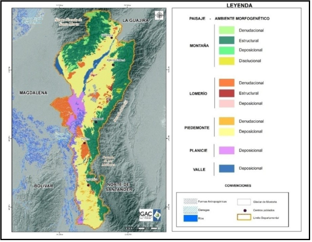 Los procesos geológicos y geomorfológicos que tienen lugar en cada uno de los paisajes que conforman el territorio del Departamento del Cesar, definen los relieves que los caracterizan y que a grandes rasgos también controlan su distribución. A continuación, se describen los principales procesos analizados que han contribuido a la conformación del relieve departamental.