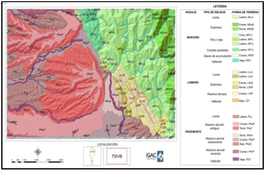 En la Figura 7, a modo de ejemplo se observa la representación de los paisajes, tipos de relieve y formas de terreno identificados para la plancha escala 1:25.000 - 75IVB IGAC.