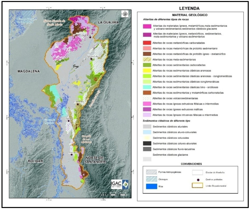 La cartografía geomorfológica aplicada a levantamientos de suelos escala 1:25.000 elaborada para el Departamento del Cesar, permitió realizar la caracterización de los materiales geológicos que recubren su territorio y que potencialmente se convertirán en materiales parentales para la formación de los suelos. Los materiales identificados y clasificados son sintetizados en la Tabla 6.