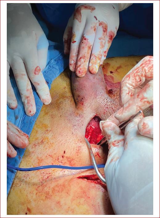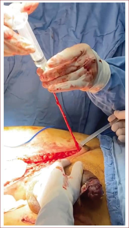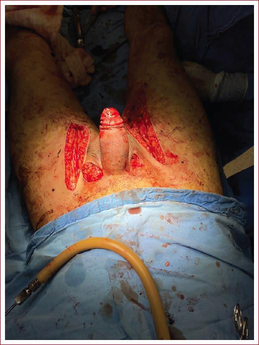 Se continúa con la base del pene, la cual se incide de manera bilateral, se diseca hasta llegar a la túnica albugínea; posteriormente se tuneliza y pasa la vena safena de manera subcutánea hasta la base del pene de cada lado. Se continúa con la incisión de la túnica albugínea en forma de uso para acceder a los cuerpos cavernosos. Se realiza un nuevo lavado de los cuerpos cavernosos, así como la administración de 5,000 unidades de heparina no fraccionada intravenosa por anestesiología y se procede a realizar anastomosis de la vena safena término-lateral con los cuerpos cavernosos con polipropileno 6-0 surgete continuo (Figs. 2 y 3), se cierra por planos y se termina el procedimiento quirúrgico. En el postoperatorio mediato, se observa el pene hiperémico y parcialmente erecto, pero sin presentar dolor o tumescencia. Se mantiene paciente bajo vigilancia en las siguientes 72 horas con enoxaparina 60 mg subcutánea cada 12 horas, con posterior egreso hospitalario, indicando para su manejo ambulatorio rivaroxabán 10 mg y clopidogrel 75 mg cada 24 horas por 30 días. Posteriormente, continuó con clopidogrel 75 mg cada 24 horas. A nueve meses del postoperatorio, en la consulta subsecuente el pene muestra fibrosis de ambos cuerpos cavernosos en el tercio medio, función eréctil conservada con actividad sexual no disfuncional.