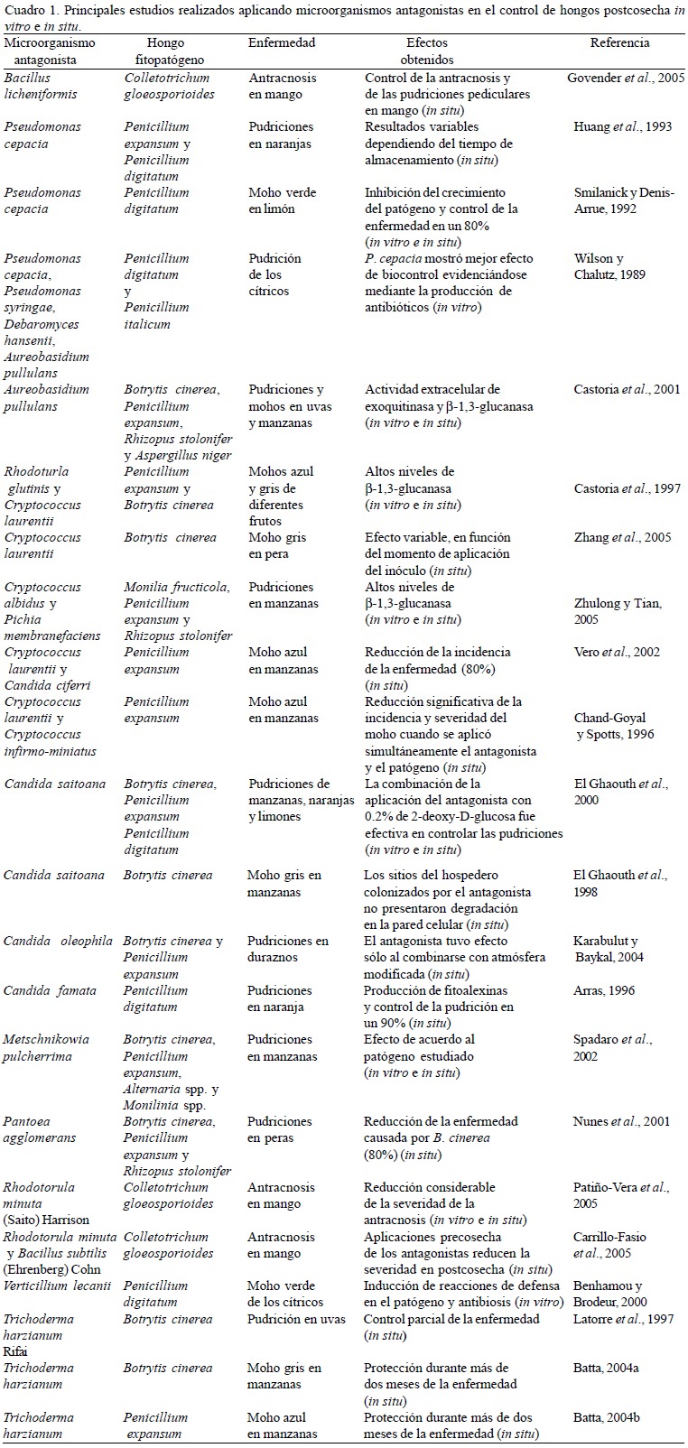 Microorganismos antagonistas en la fase de postcosecha. El uso de microorganismos antagonistas para controlar las enfermedades postcosecha se plantea mediante dos enfoques importantes, que consisten en la estimulación y el manejo de los antagonistas presentes sobre la superficie del fruto, y en la introducción artificial de antagonistas contra los patógenos. Éste último, se favorece bajo las condiciones actuales de almacenamiento controlado de los productos (Wisniewski y Wilson, 1992). Son diversos los efectos benéficos de los microorganismos que durante años han sido utilizados, en esta área de estudio se abren potencialmente las perspectivas del empleo de los microorganismos antagonistas para controlar las enfermedades postcosecha. Las levaduras son más utilizadas que las bacterias para controlar las enfermedades postcosecha y en menor grado los hongos. En el Cuadro 1 se resumen algunos estudios realizados utilizando microorganismos antagonistas para el control de las enfermedades postcosecha. Las levaduras empleadas como antagonistas han mostrado efecto antifúngico sobre diferentes patógenos postcosecha; los mecanismos de acción no han sido del todo establecidos, aunque se sugiere que existe la antibiosis, producción de enzimas líticas, parasitismo, competencia por los nutrientes y espacio e inducción de resistencia (El Ghaouth y Wilson, 1995). El control biológico constituye una tecnología emergente para controlar las enfermedades postcosecha; es importante considerar la resistencia a este tipo de enfermedades porque ésta podría ser diferente a la resistencia en campo hacia hongos; se ha observado que pocos antagonistas son efectivos cuando se trasladan del laboratorio al campo (Wilson y Wisniewski, 1989). Mclaughlin et al. (1990) establecieron criterios para diferenciar taxonómicamente las levaduras que pueden ser utilizadas potencialmente. Por otra parte, Guerrero-Prieto et al. (2004) identificaron levaduras epífitas de manzana [Malus sylvestris (L.) Mill. var. domestica (Borkh.) Mansf.] que pueden ser utilizadas para biocontrol en postcosecha.