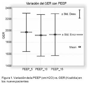 Material y método: se incluyeron nueve pacientes con ventilación mecánica controlada por presión internados en la unidad de cuidados intensivos. Se efectuó CIcon el propósito de medir el GER, VO2 y VCO2 así como el volumen minuto (VE) en tres diferentes niveles de PEEP. Para el análisis estadístico se utilizó la prueba de la t pareada y Wilcoxon se calcularon los coeficientes de variación de las variables en estudio.