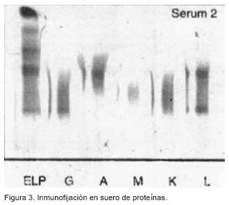 La inmunofijación en suero de proteínas (Figura 3) reveló la presencia de gammapatía biclonal con un componente de IgA lambda y un segundo componente de IgG lambda.