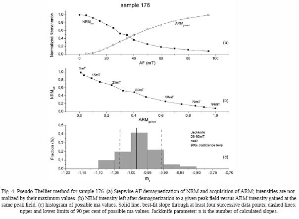 Fig. 4 shows the pseudoThellier results of the sample 176. Fig. 4a shows stepwise AF demagnetization of NRM and acquisition of ARM, with the intensities normalized to their peak values. The best fit slope (ma) is obtained from the Arai plot (Fig. 4b), the NRM intensity left after demagnetization versus the ARM acquisition intensity (at the same peak field), by using two versions of a jackknife resampling procedure (Efron, 1982). Fig. 4c represents a histogram of the calculated slopes (ma). The solid line represents the bestfit slope; dashed lines point out the upper and lower limits of 90% of possible ma values.