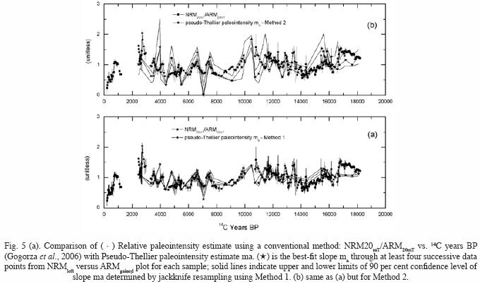 The pseudoThellier paleointensity records were compared with the authors previous results where the remanent magnetization at 20mT (NRM20mT) has been normalized using the anhysteric remanent magnetization at 20mT (ARM20mT), the saturation of the isothermal remanent magnetization at 20mT (SIRM20mT) and the low field magnetic susceptibility (k) (Gogorza et al., 2006). The pseudoThellier record shows a reasonable agreement with the standard method of normalization (NRM20mT/ ARM20mT).