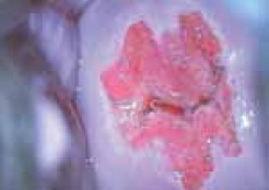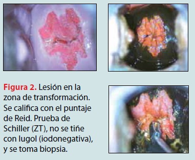 Se les realizo su historia clínica y exploración ginecocolposcópica, colocación de espejo vaginal, con nueva toma de citología cervical, limpieza del cérvix con solución salina; se llevó a cabo examen colposcópico y se visualizaron las características del cérvix, la unión escamocolumnar, la zona de transformación, para luego aplicar ácido acético al 3%; se visualizó nuevamente con el colposcopio para posteriormente aplicar la solución de lugol y observar las características tintoriales. Metódicamente se aplicó el índice colposcópico modificado de Reid para otorgar una calificación de 0 a 4 puntos compatible a LEIBG (VPH o neoplasias intraepiteliales cervicales [NIC] grado I-II); 5 a 8 puntos compatible a LEIAG (NIC III y cáncer in situ) (figuras 1-4 [2,3]).